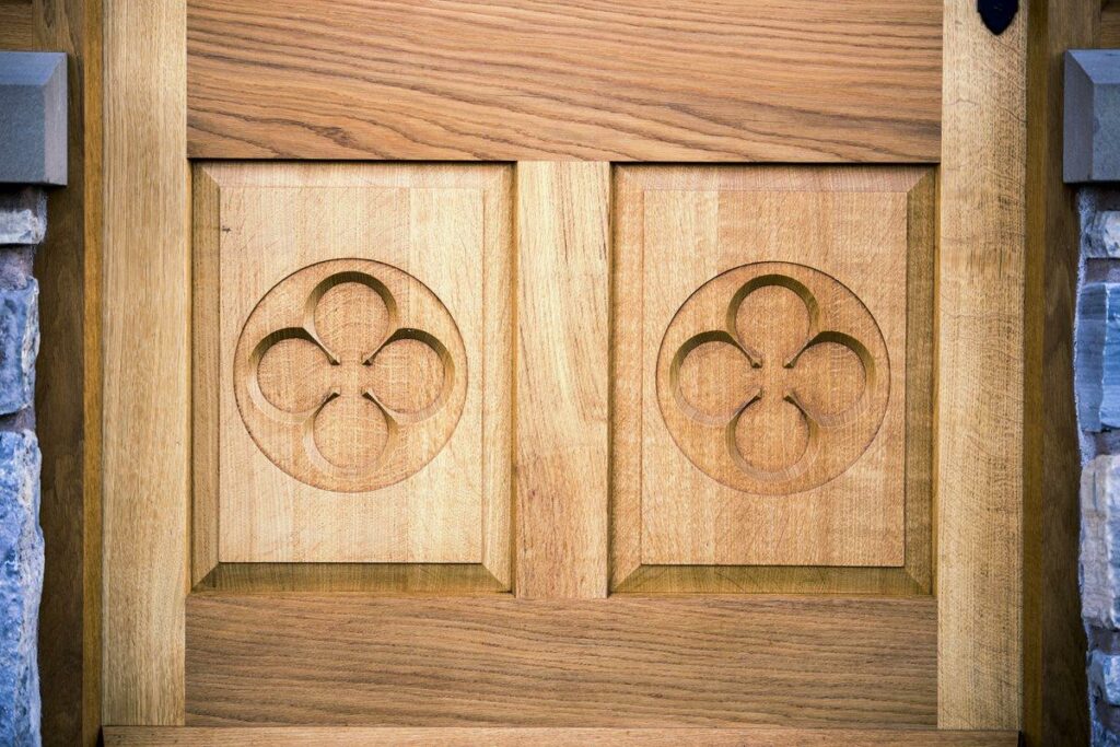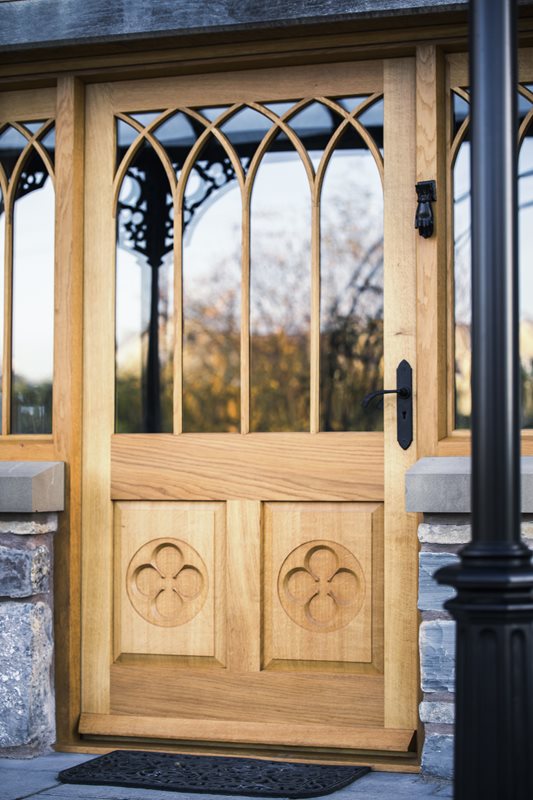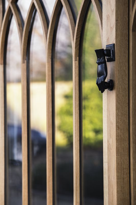 We developed a design that incorporated the hand machining of ‘quatrefoil’ details in the lower panels of the screen door rather than a simple raised and fielded panel. The Gothic arched glazing detail in the upper section of the door continues into the sashes either side which, unlike the previous solid door, allow natural light to flood in and fill the hallway.