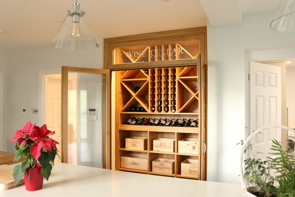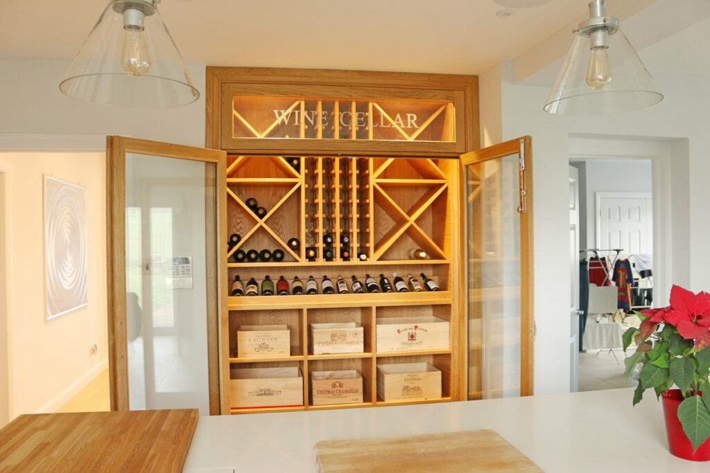 A client with a passion for collecting fine wine wanted a place to store his wines but did not have a cellar. So we created a ‘wine cellar’ in his kitchen. Not a dark cupboard where the bottles would be hidden away, but a beautiful glass fronted wooden wine store that would allow him to showcase his impressive collection of wines.