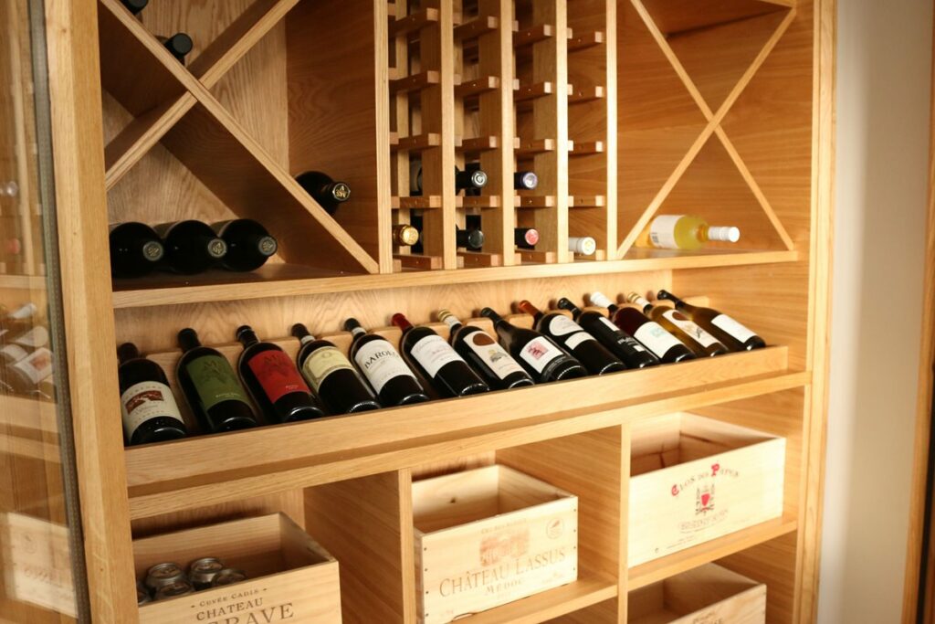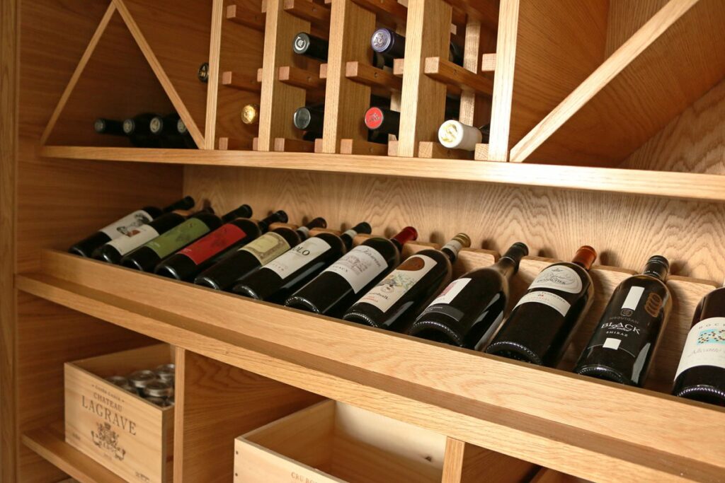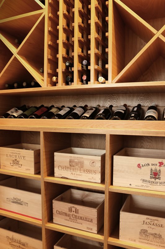 The lower section of the ‘wine cellar’ provides space for storing wine in wooden crates. Above this are further shelving sections where wines can be laid down and stored.